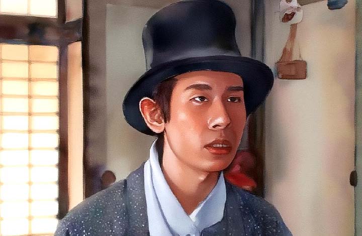 その特徴的なアイテムは、山高帽よりもさらに高さのあるシルクハット。まるで上流階級の紳士のような装いで、落ぶれた元武士でまだ髷を結っている司之介とは対照的な存在感を放っています。